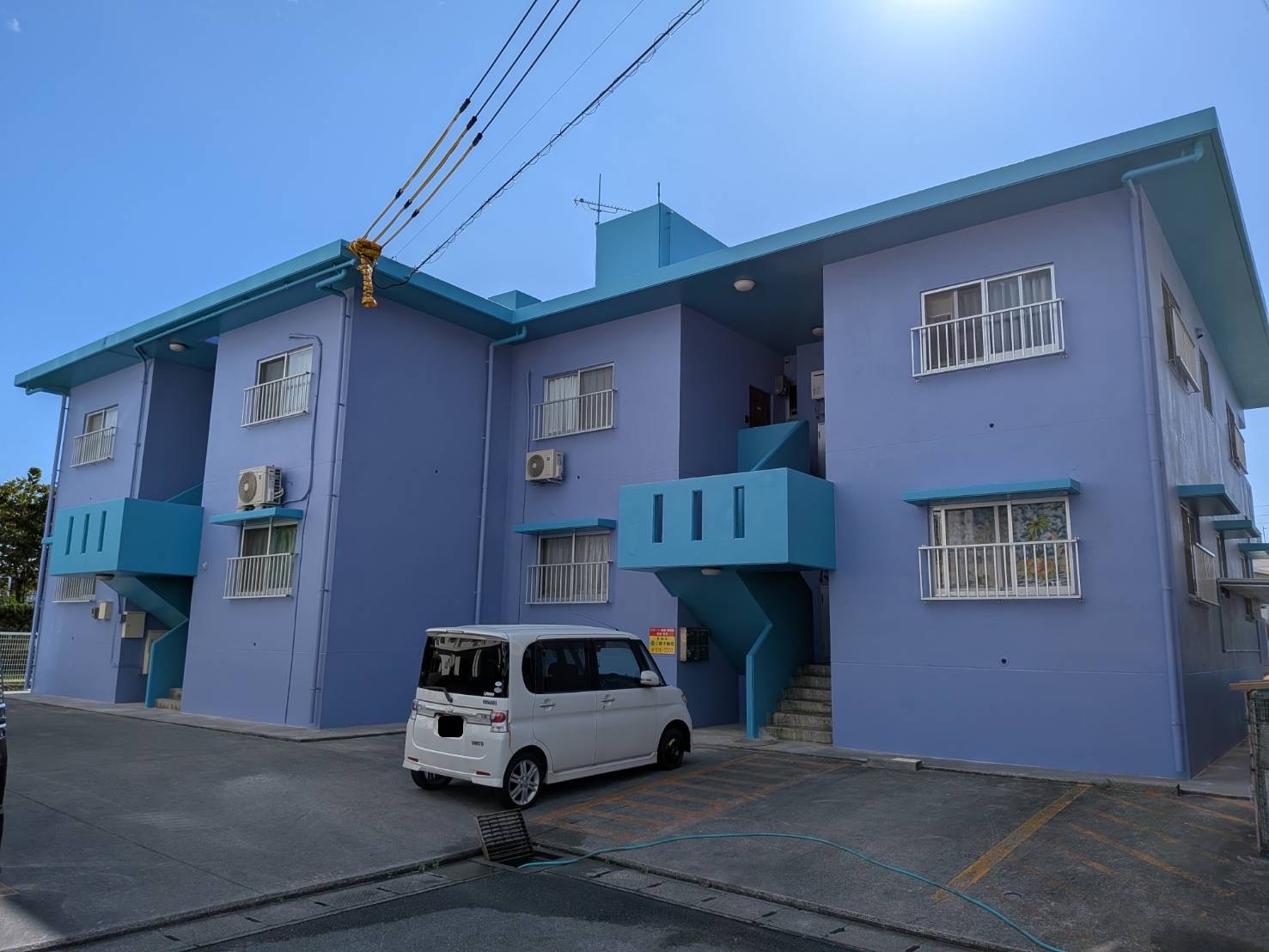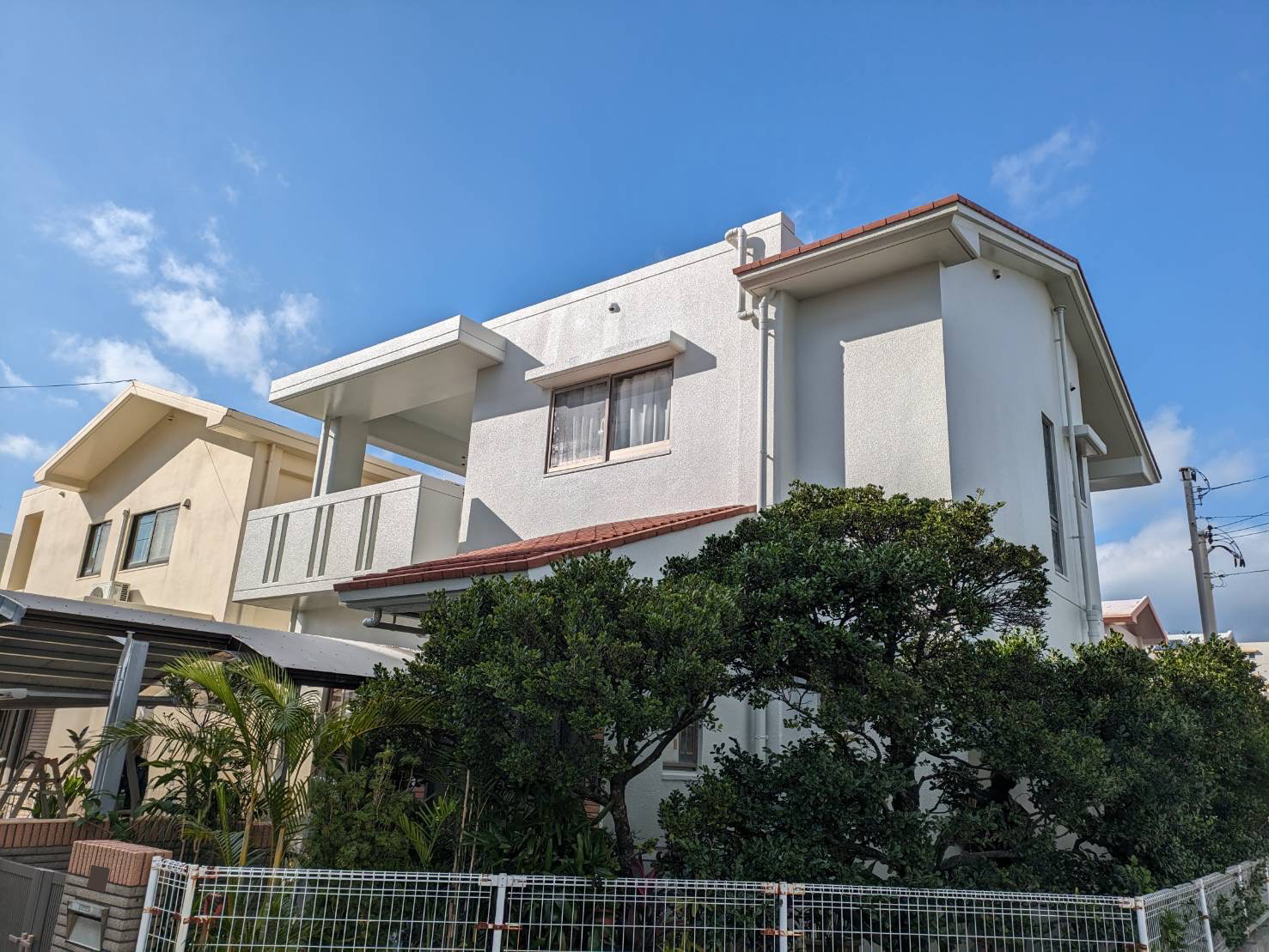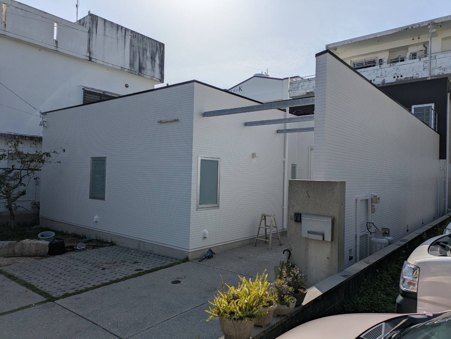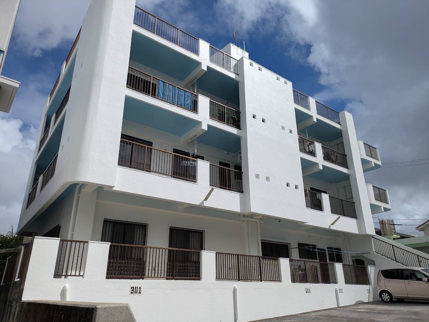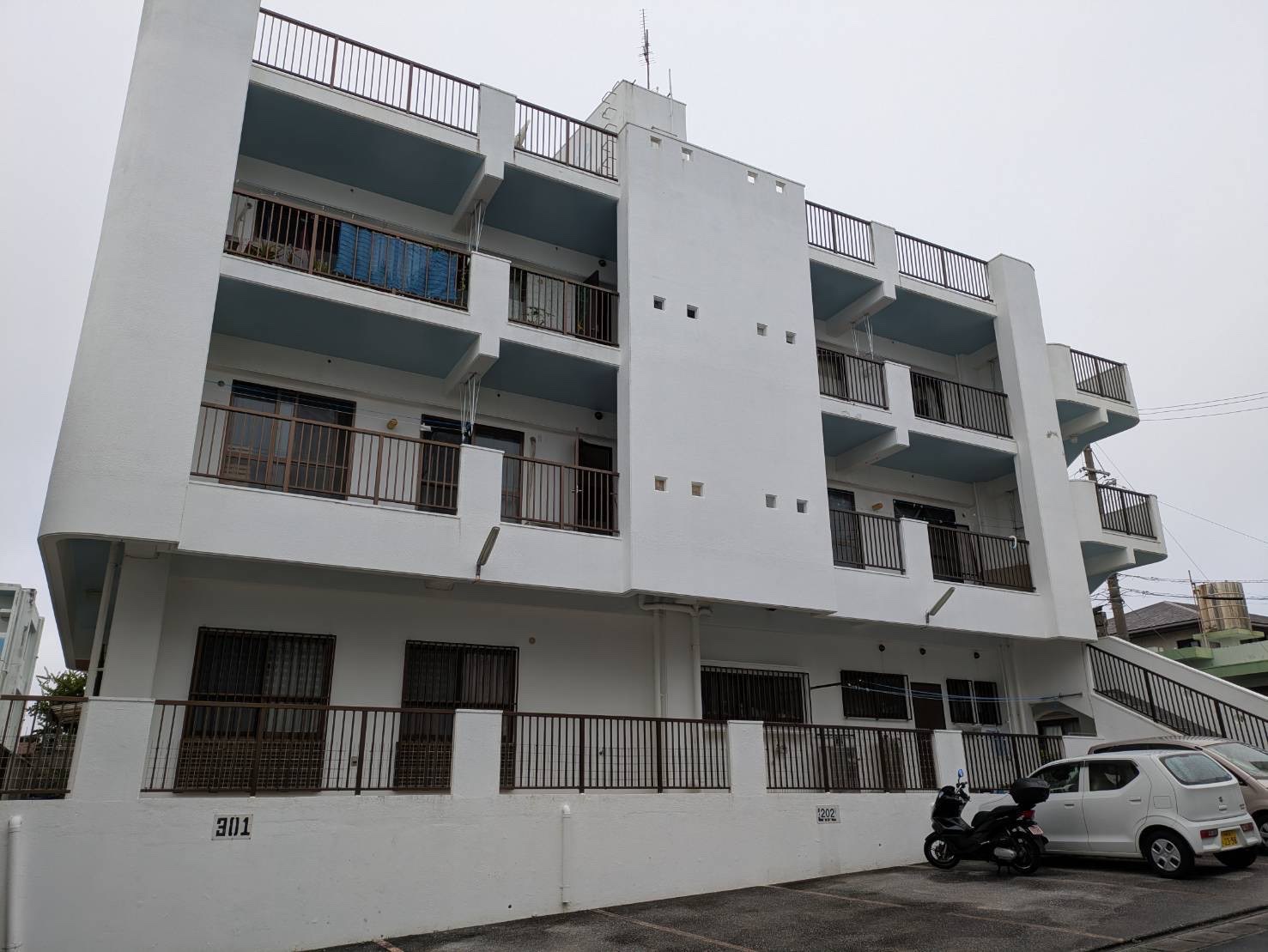 高圧水洗浄、ひび割れなどの下地補修を行い、塗替え前と同色のホワイトカラーで塗替えを行いました。