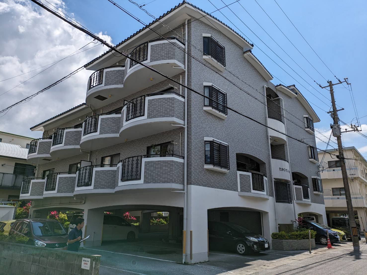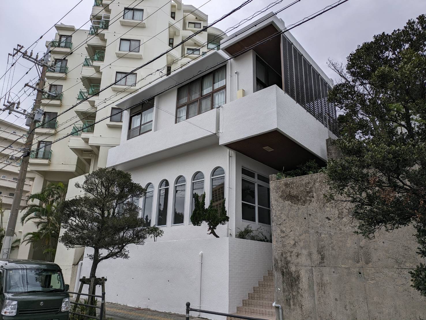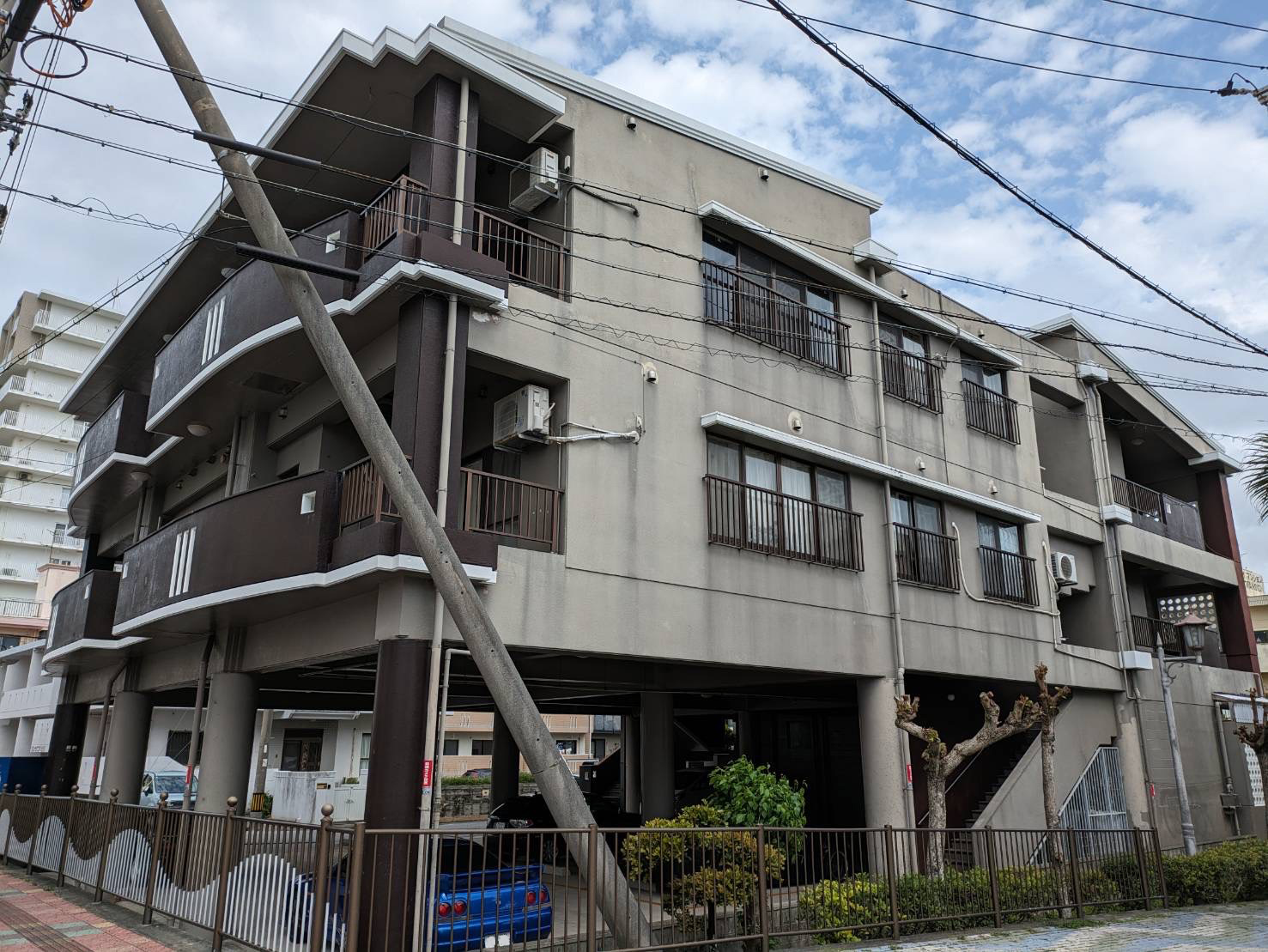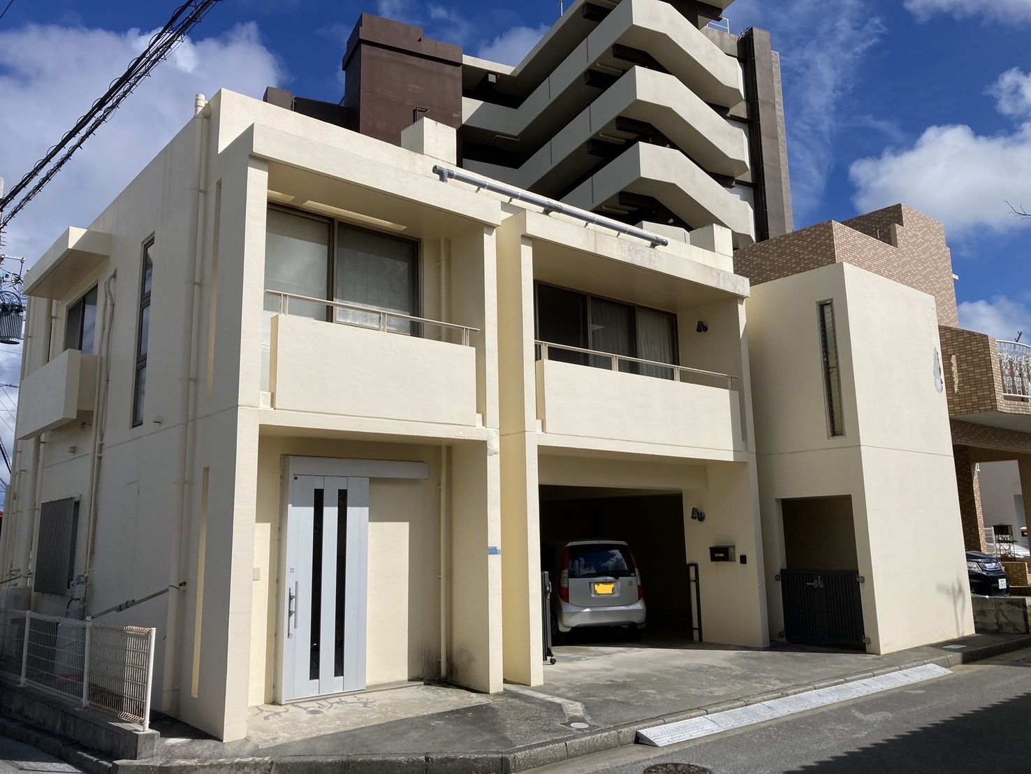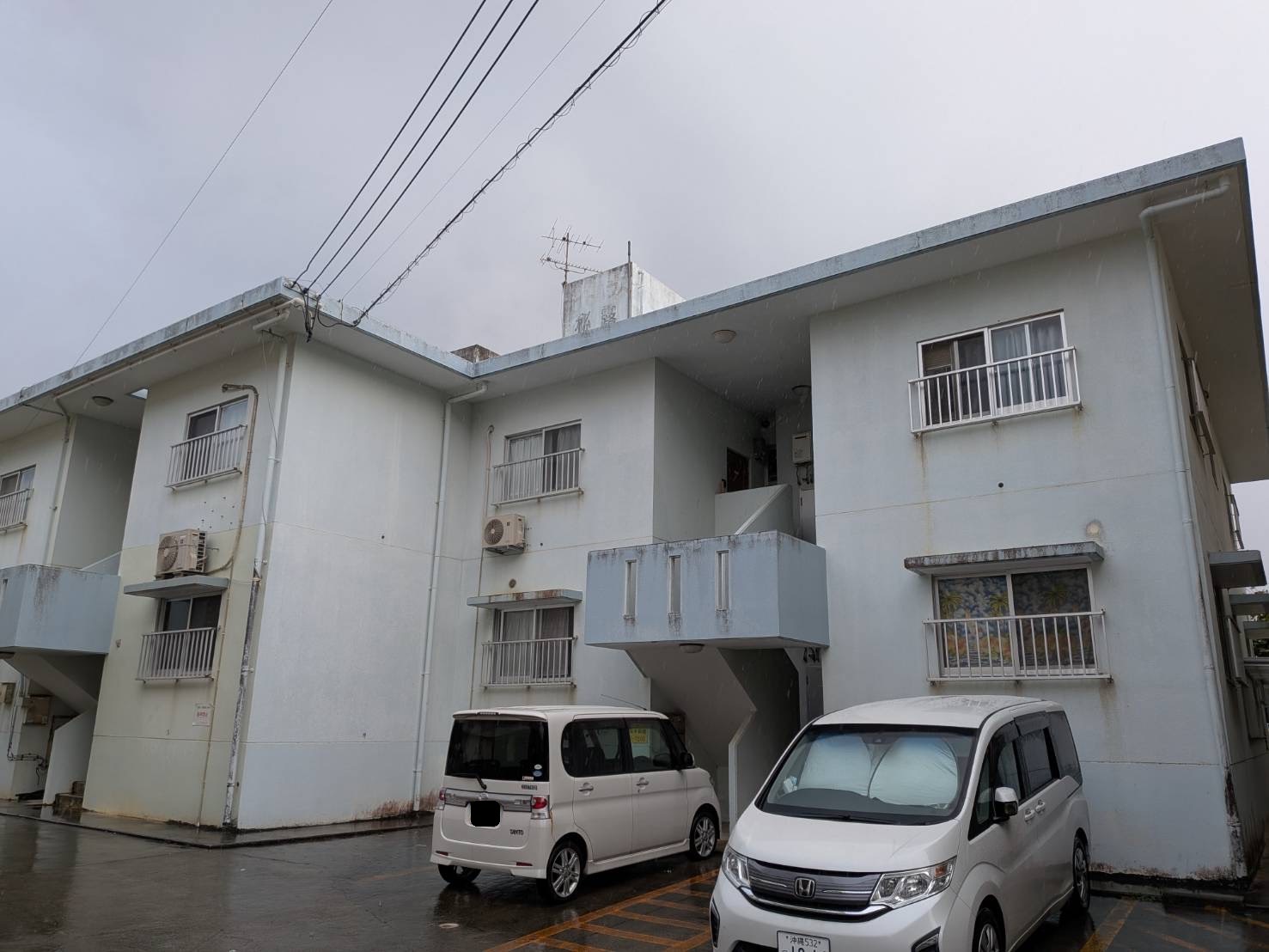高圧水洗浄、ひび割れなどの下地補修を行い、塗替え前と同色のホワイトカラーで塗替えを行いました。
