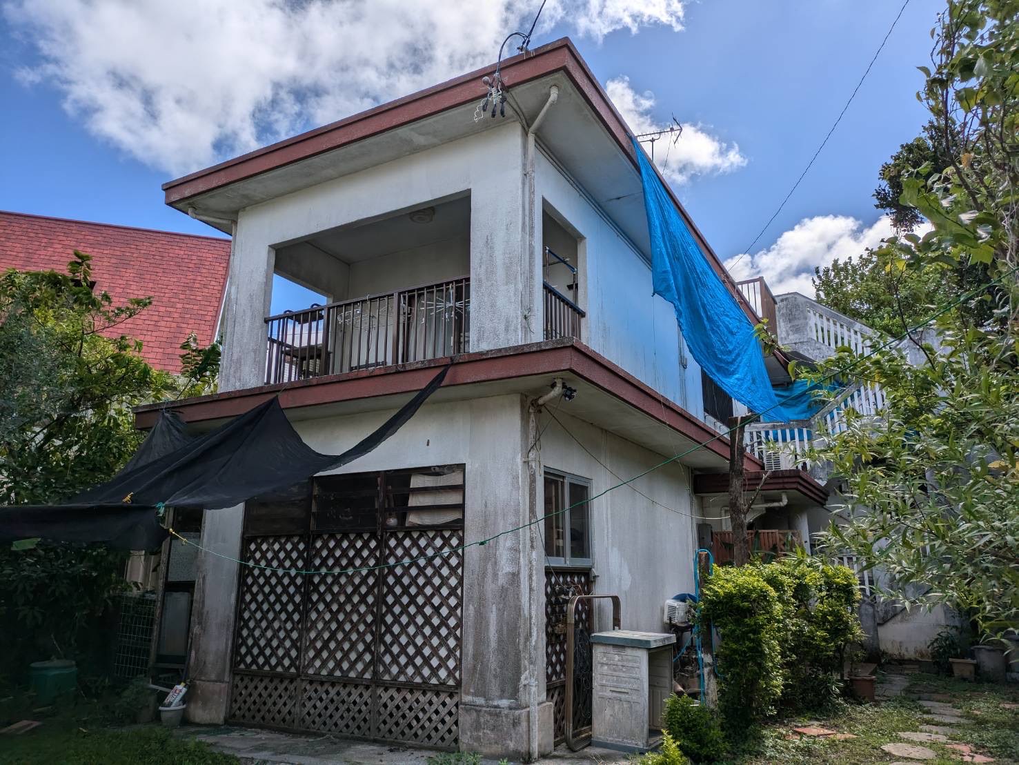 随所に塗膜の剥がれや黒カビ・苔の発生等が見受けられました。