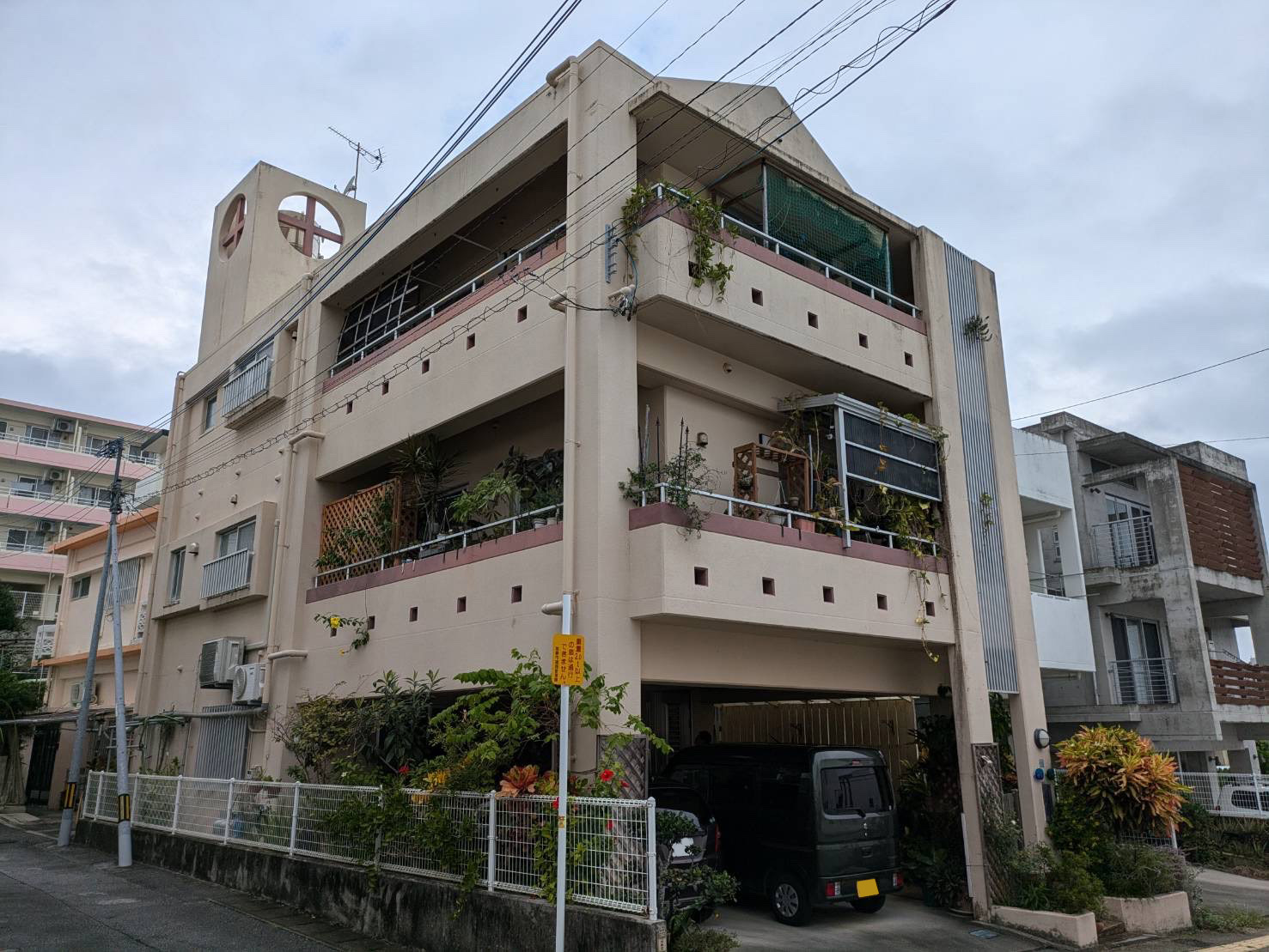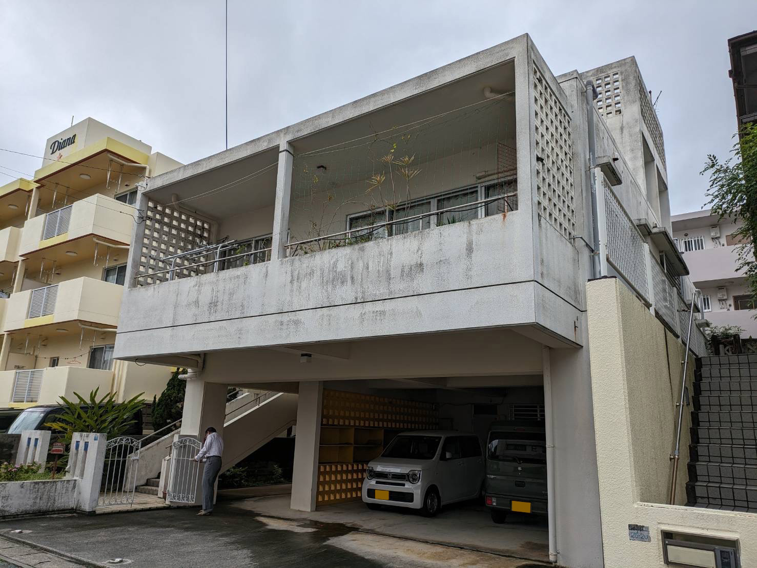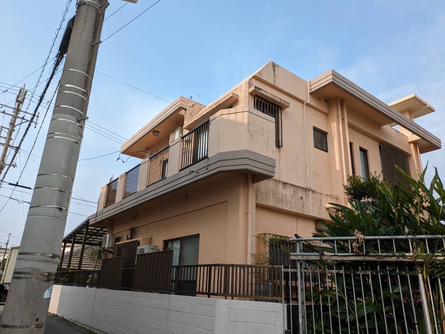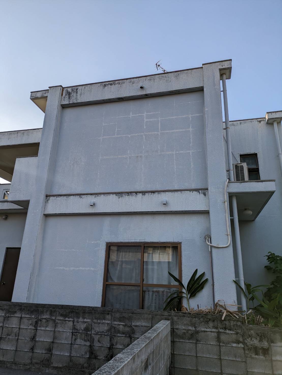 外壁は無塗装でコンクリートの劣化があり、所々に浮いている箇所がみられました。