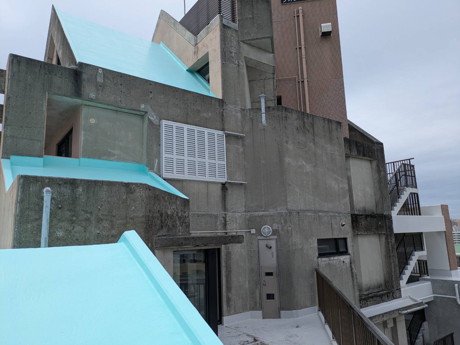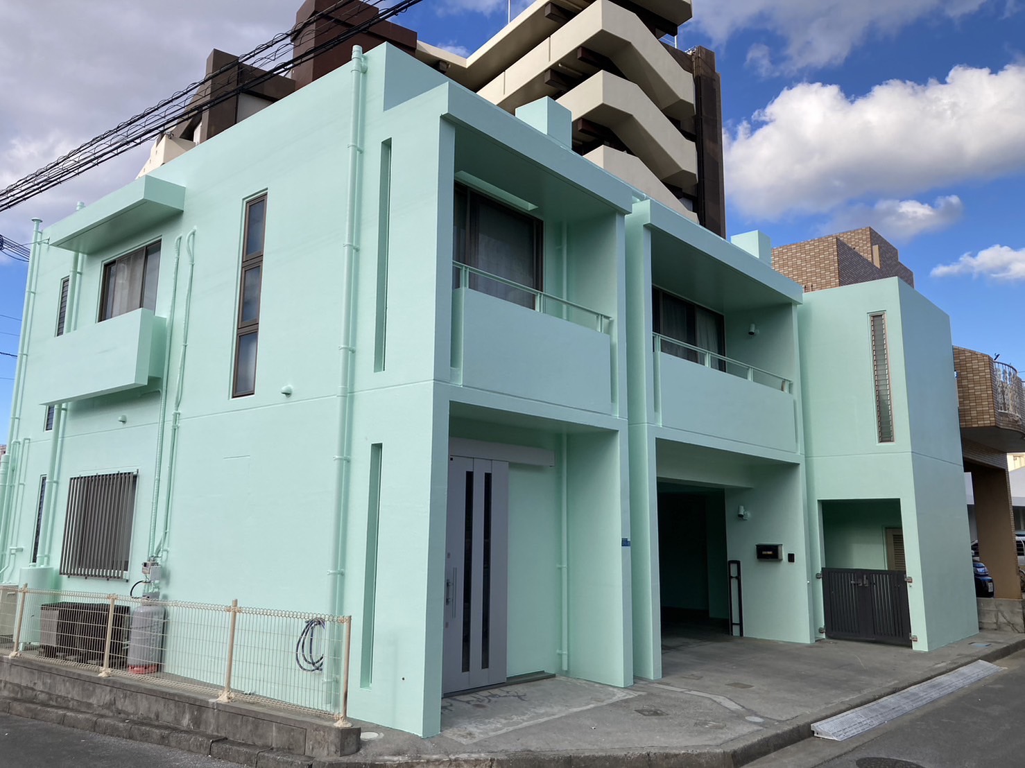 高圧水洗浄で汚れを洗い流し、ひび割れなど細かな補修工事を行った後、塗料を密着させるためのシーラーを塗り、最後に爽やかなミントグリーンの上塗り塗料で仕上げました。