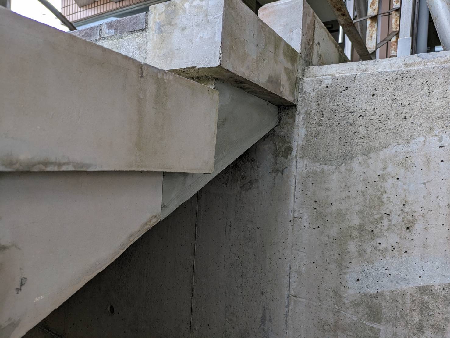 鉄筋が錆びて膨張しコンクリートを押し割り、欠落しています。住民や歩行者に当たると危険です。