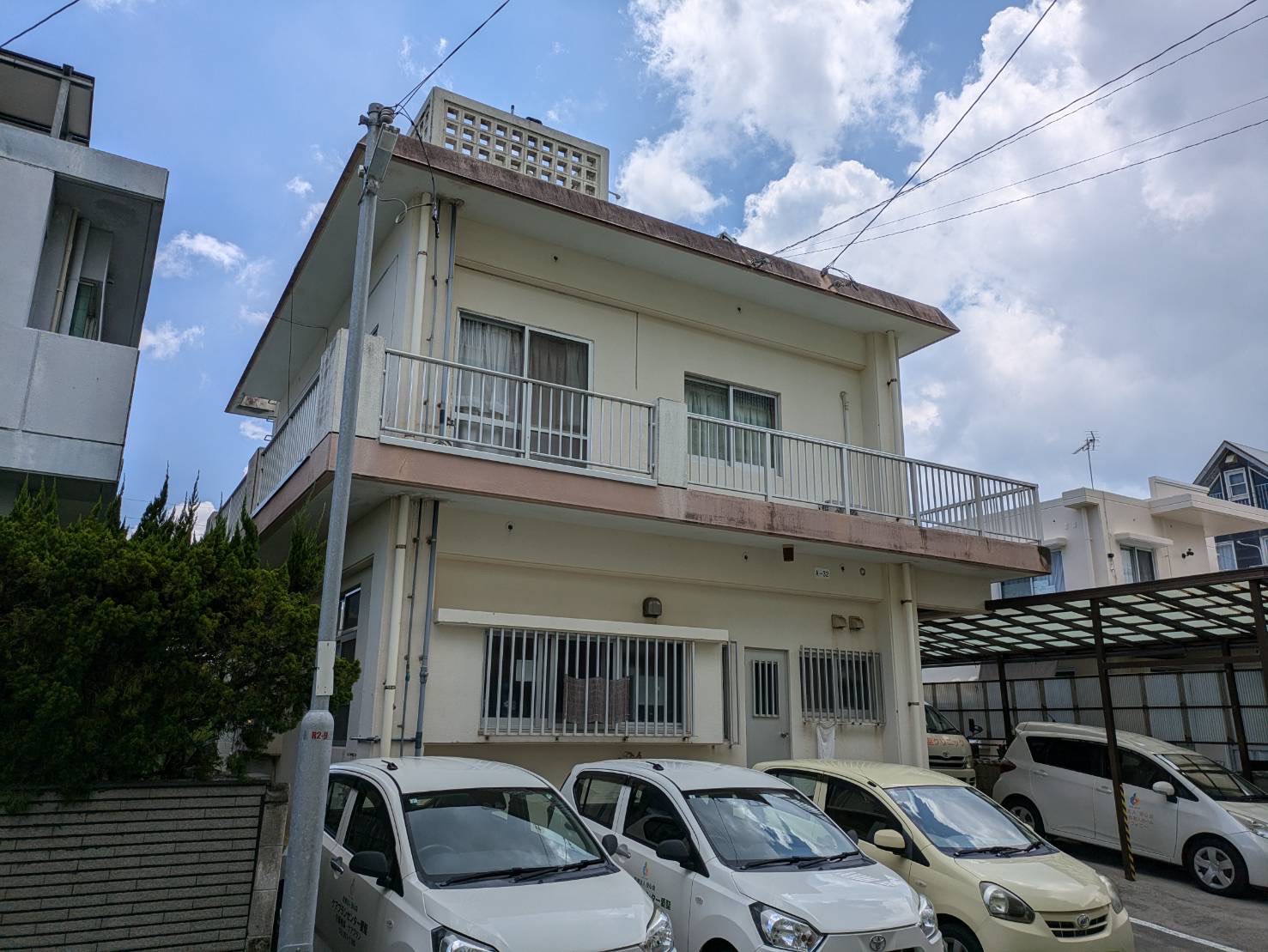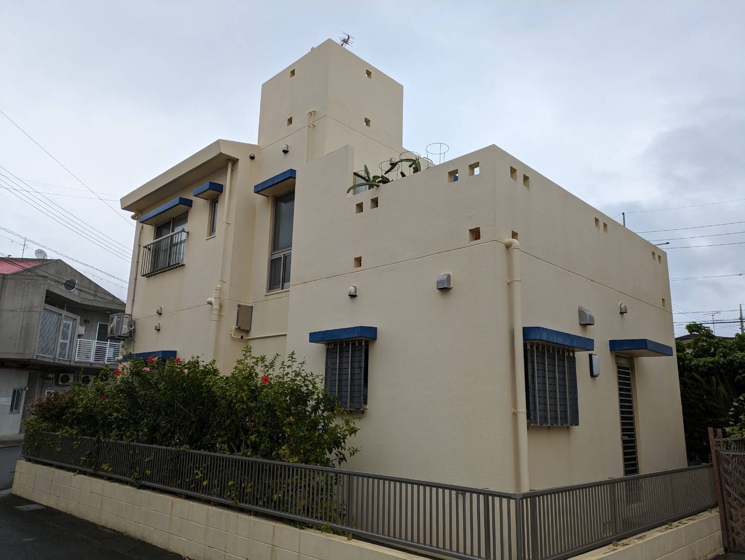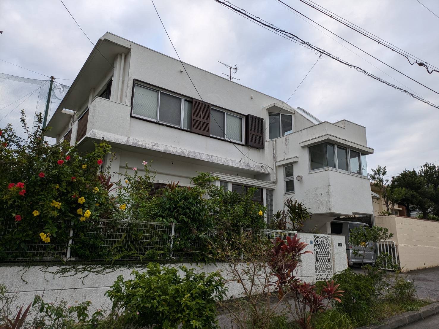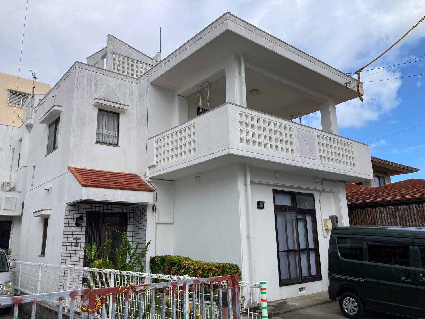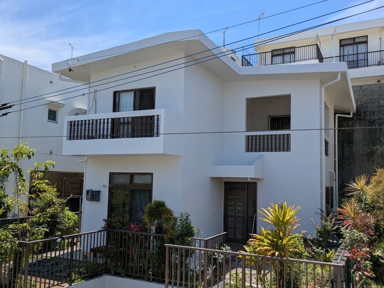 高圧水洗浄、ひび割れなどの下地補修を行い、塗替え前と同色のホワイトカラーで塗替えを行いました。